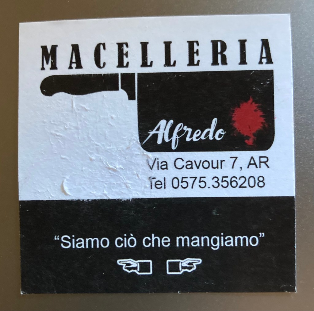When you walk out of Alfredo’s shop and take a left, Piazza di San Francesco is the next big attraction. There is a large stone church with several stairs that drape off the front, a frequent hangout for the chic cool kids on a Friday and Saturday night, dressed in their best, holding beers, cocktail drinks, or wine glasses, using the stairs as bleachers. If you are up early enough the next morning you can see broken beer bottles or unfinished drinks on the steps, and random black straws all over the ground. Cemented in these steps is a pillar holding a monument of Vittorio Fossombroni caressing a lion. To re-cap, take a left out of Alfredo’s, approach Piazza San Francesco, when you see the statue, take a left on Via Madonna del Prato. It is a downward sloped cobblestone road that rarely has vehicles on it. Bars and restaurants on either side of the narrow street, if you continue downhill there are hair salons, barbershops, clothing stores, a tattoo shop and a small artigianal beer joint. Next to the beer place, strategically placed is Masterchips, a place to buy take away french fries with an assortment of dipping sauces. A door down from Masterchips is Dini’s butcher shop, another renowned butcher in Arezzo. The morning I went to Alfredo’s for Sam’s order, I took this exact path on my way to work. Almost on cue Dini walks out at the moment I’m in front of his window, holding a stack of collapsed boxes to put them on the corner for cardboard pick up. I was holding a clear plastic bag with my items wrapped in butcher paper, it was obvious I had just been to the butcher up the street. He was dressed in a white lab coat over green scrubs and white rubber clogs. He is a tall man with a head full of light grey hair. I felt at fault almost, I have nothing against Dini’s shop, it’s actually my go to place when I need to impress someone with a great Tuscan dish, as a matter of fact, I heavily rely on his duck ragù when I need to hit a home run in the kitchen. My heart sank, he was my original teacher, he patiently had instructed me on how long each cut needed to cook for and with kindness asked me how many people I would be serving and make his little suggestions on what I can pair the piece with. Dini has a few things that Alfredo doesn’t have, he has lamb, entire rabbits, entire foul, and on occasion I have seen pigeon. He also has a larger selection of the home made delicacies that are big pieces of meat inside of what looks like a string fish-net stocking, stuffed with other ingredients, and topped with either a citrus, rosemary, sage, bay leaves and a coarse scrub of spices. IF I had stopped at Dini’s and walked by Alfredo’s, I would have been caught red-handed. Dini now provides white bags with their large logo on each side, for your purchases, the bag resembles one of those white Prada shopping bags. Alfredo has a nice quality butcher paper but top of the line business cards, I currently have one on my dresser. Square card with a black and white photo of Alfredo holding a steak on one hand and another big piece of meat on the other, in his mouth he has coiled sausages linked together, hanging out either side, the meat is the only color on the card, red of course. The back of the card has a black cleaver with white chunky letters that say “Alfredo” below the cleaver it has their address and phone number and a quote that says “Siamo ciò che mangiamo” meaning, we are what we eat.